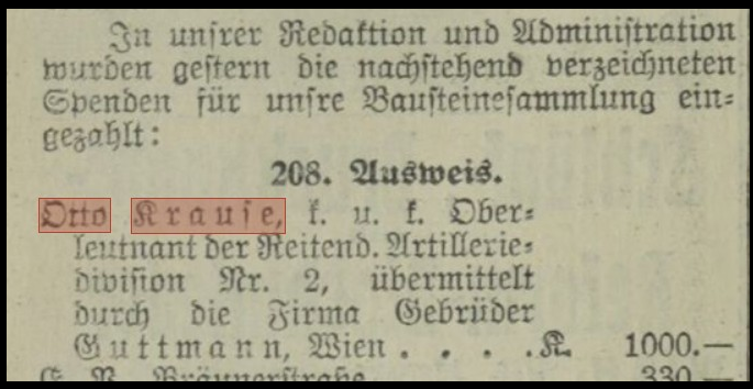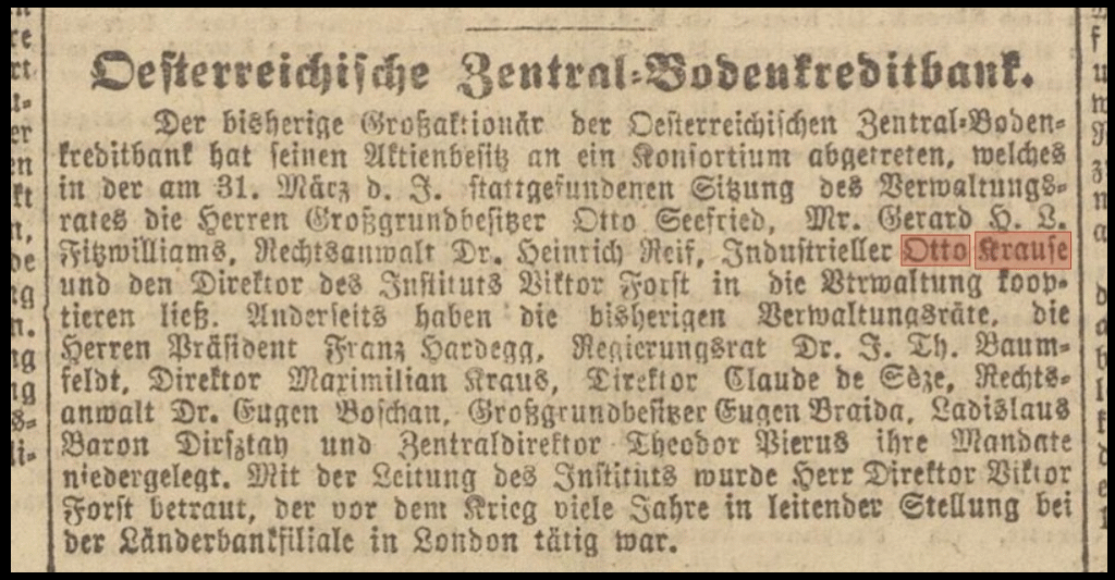 There have been questions as to what Otto did as a profession or job. The feeling was that he might just have been living off the riches of his first wife, who did come from a wealthy family, or from the income of Lehmann. At the bottom of this page you’ll see the result of Peter Clausen’s research. Through that detective work, he has found that Otto advanced in his military career and even was given honors. His other professional involvement included working for the „Zentral-Bodenkreditbank“ on their board of advisors. Some of the other job titles that Herr Clausen and others have noted are: “a Vienna Industrialist”, ” a broker”, “a merchant”, “a banker”, and a “vice-president of an insurance company.”