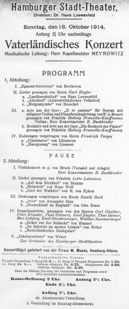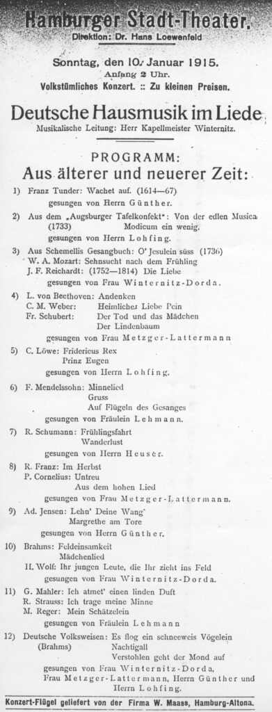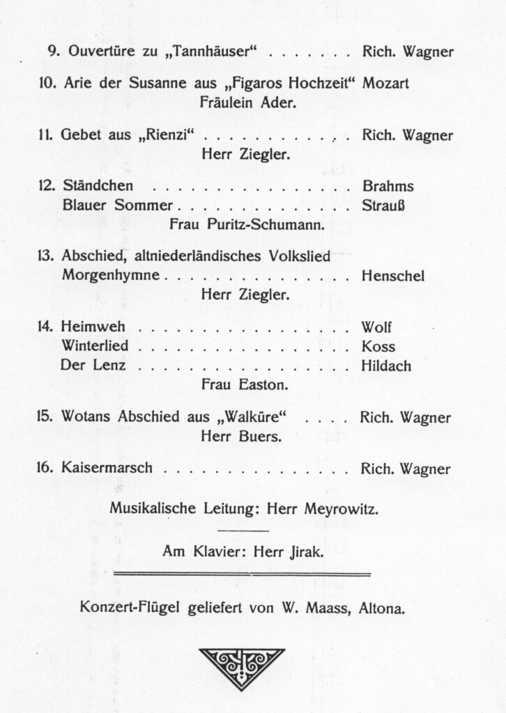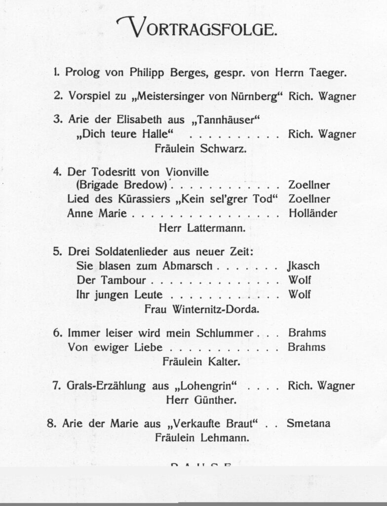 We had hardly written about the notice above before another email came from Herr Clausen with the missing information. Lehmann was indeed scheduled to sing in the “Great Concert Hall” and the pianist is none other than Professor Ferdinand Foll. He was a former friend of Hugo Wolf and knew what a recital should be. The composers included Brahms, Schumann, Cornelius, Marx, and Strauss.
