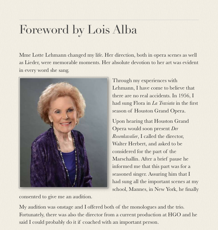 Following is the Foreward she wrote for Gary Hickling’s iBook Volume 6 in the series Lotte Lehmann & Her Legacy.