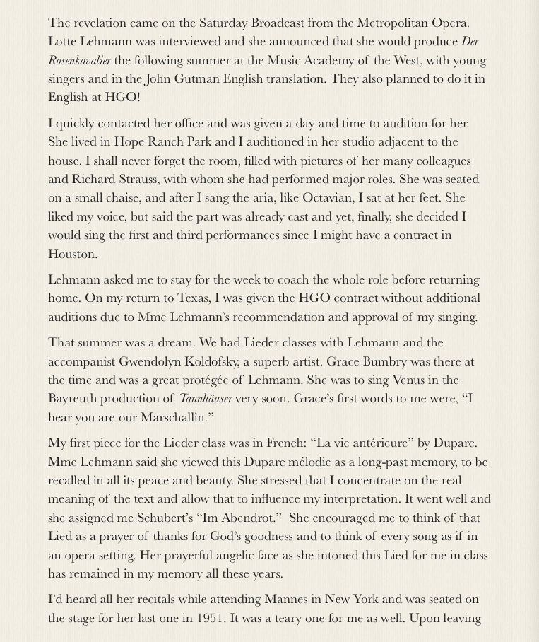 “Lehmann, who had just retired from the stage and was heading the vocal program at the Music Academy of the West in Santa Barbara, accepted me for the nine-week summer session in 1953. Based on what she heard in our voices, she created an individual recital program for each singer whom she took on as a student. This was a special and unique gift, reflecting her largesse, and it proved to be of great value to me as I continued in my studies.