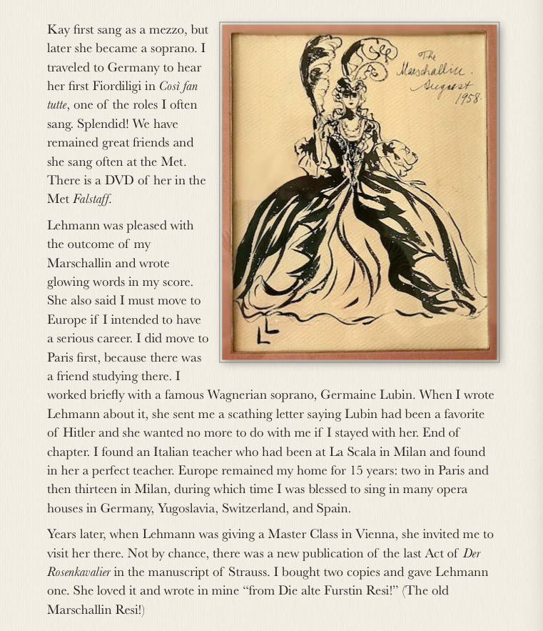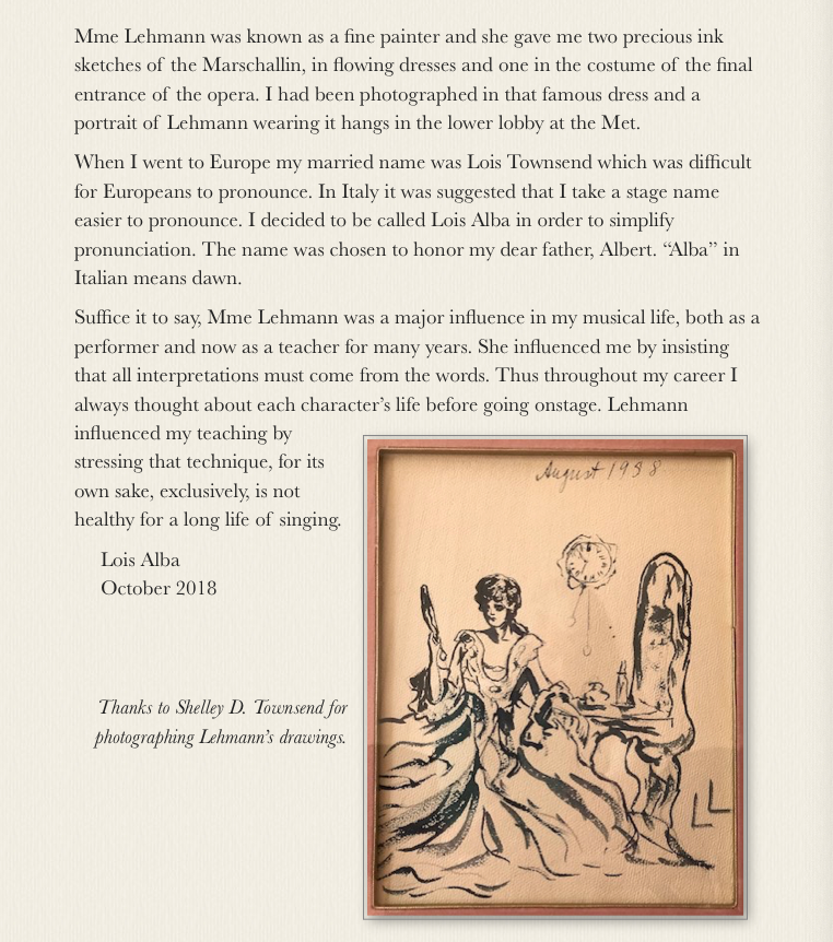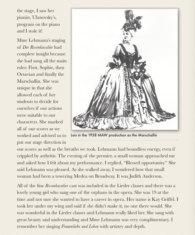 “Sometimes, when we just couldn’t achieve the results she wanted, Lehmann would step onto the stage to sing an aria or song, often an octave lower, that we were working on. On days when her allergies were not bothering her, she would sing it as written. Watching and listening to her, we were mesmerized by her ability to transform herself magically into another persona and overwhelmed by the depth and range of emotion she expressed.