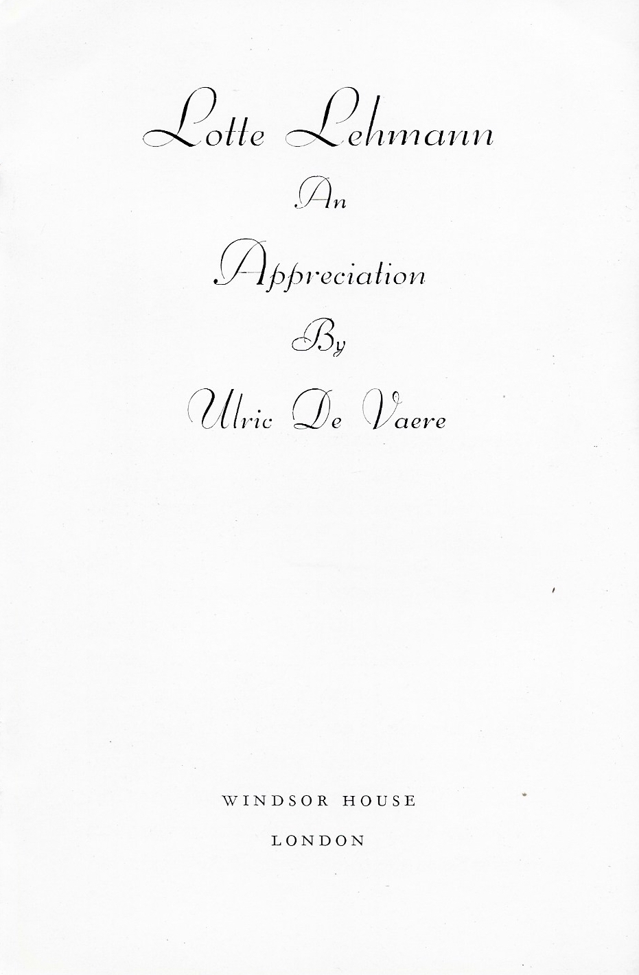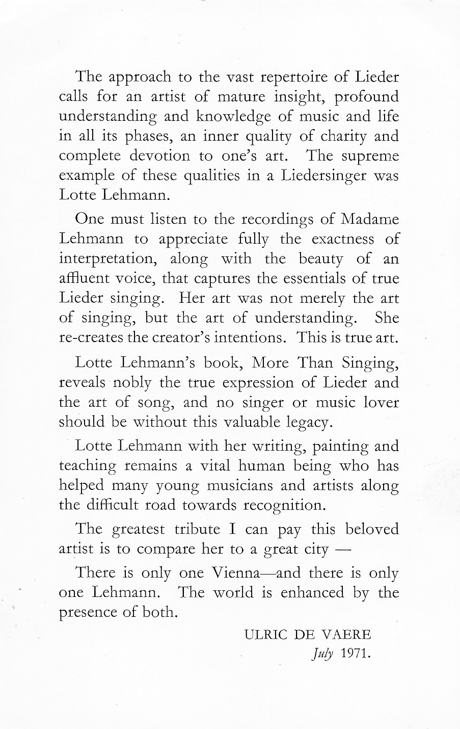 Tribute Pamphlet • Ulric De Vaere (poet, author, born in 1932) wrote a Lotte Lehmann tribute pamphlet in 1971.