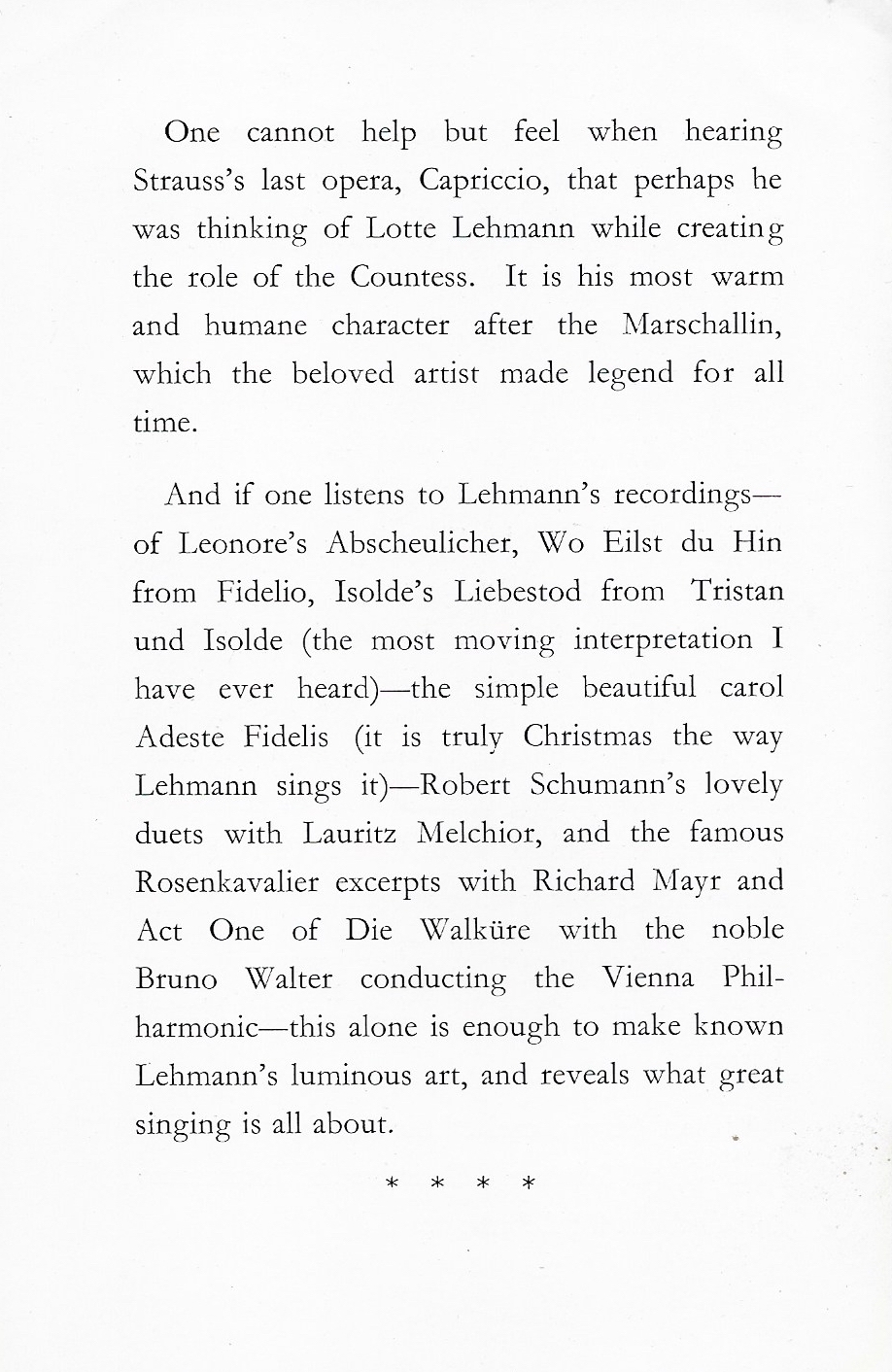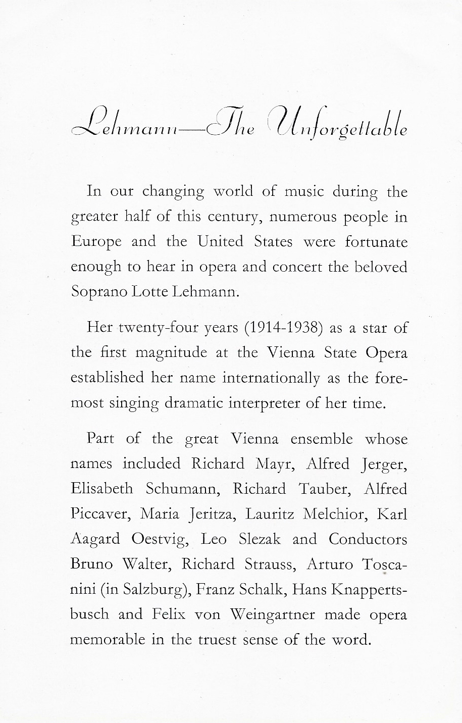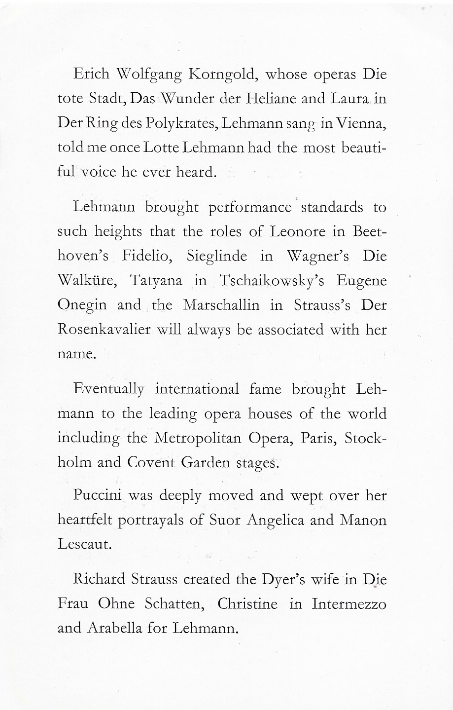 On 13 July 1986 the Music Academy of the West offered a tribute called “In Honor of Lotte Lehmann” which you can view as a PDF at the bottom of this page.