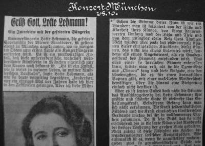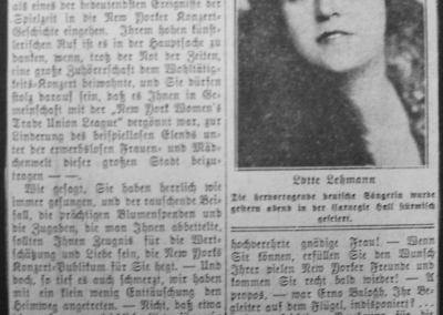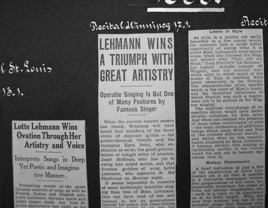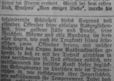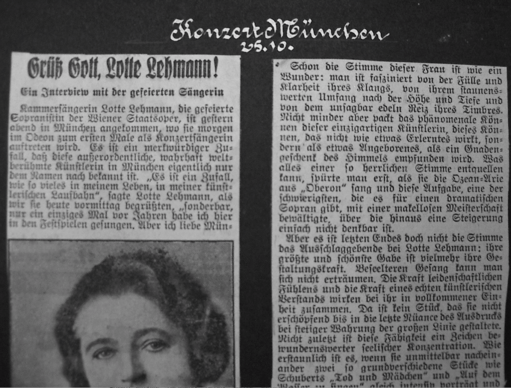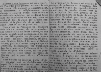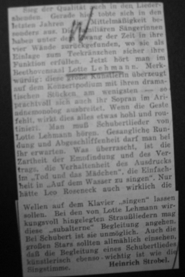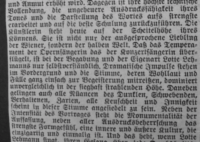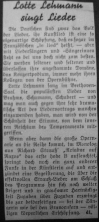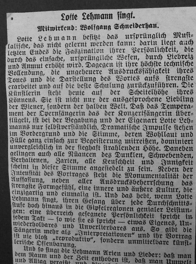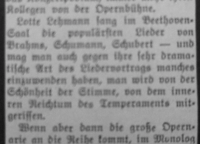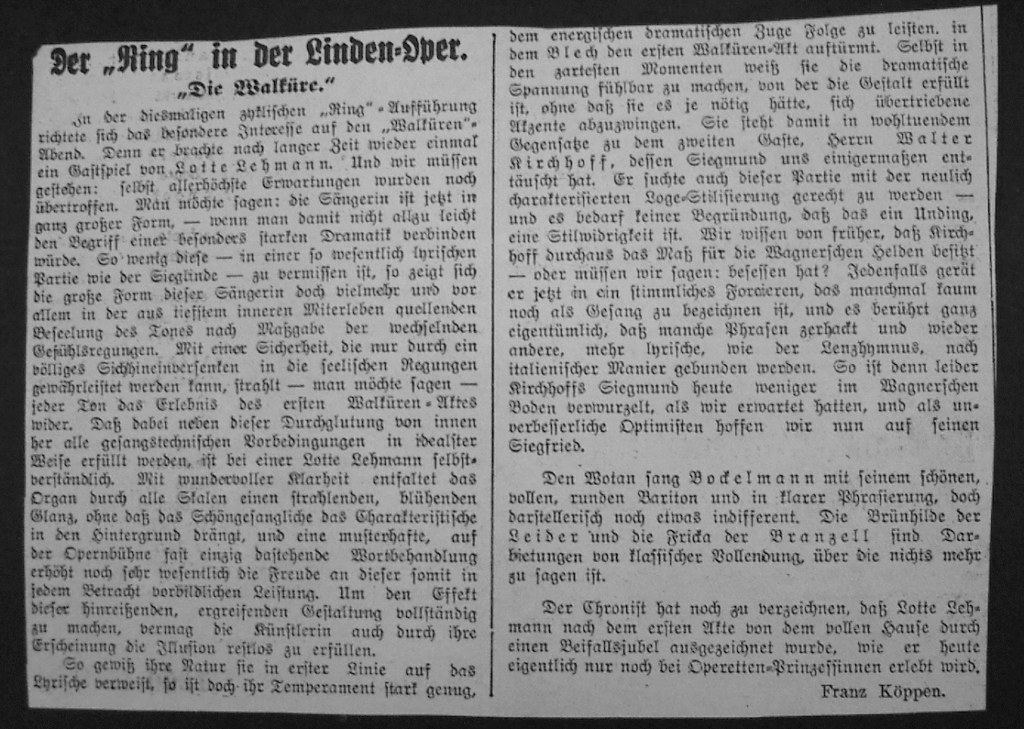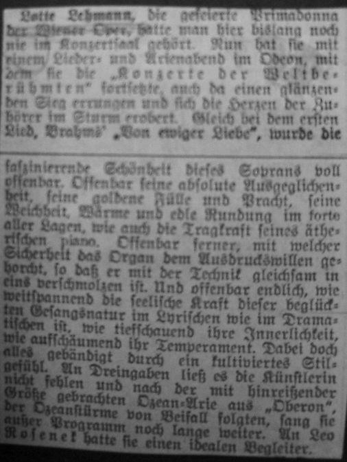 Here’s your chance to read the actual reviews and announcements of Lehmann’s Vienna years. Many thanks to Peter Clausen for his research! We begin with Julius Korngold’s review of the world premier of Frau ohne Schatten by Richard Strauss. Notice the detail with which he writes. And we offer some of Lehmann’s reports from her South American tour. From Die Bühne here are three reviews. At the bottom of this page are various reviews from Europe and the U.S.